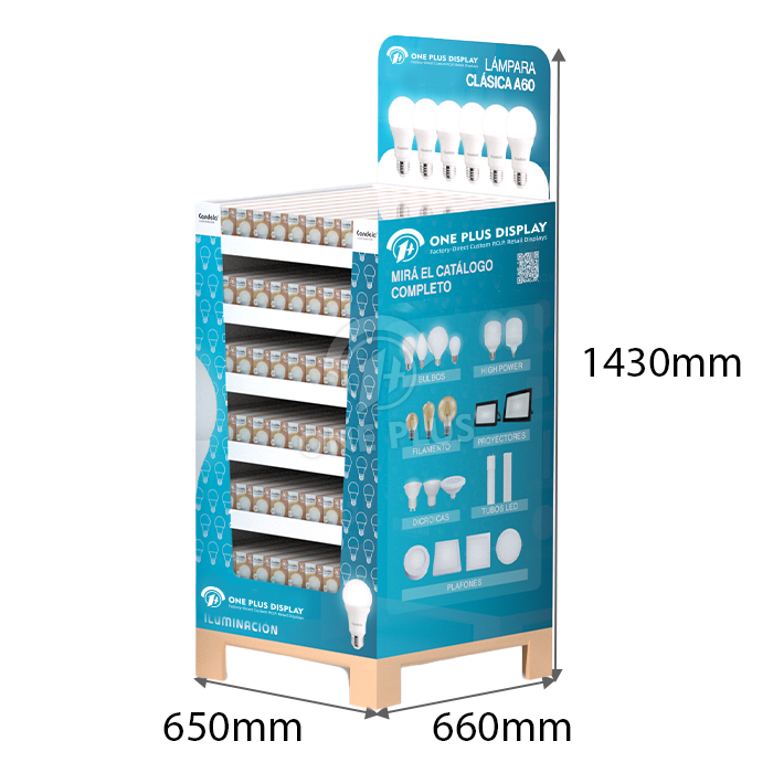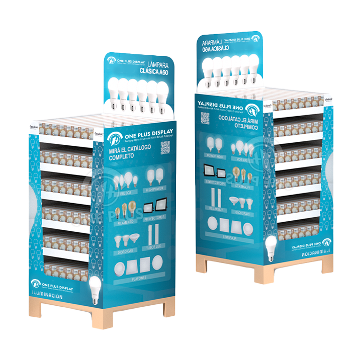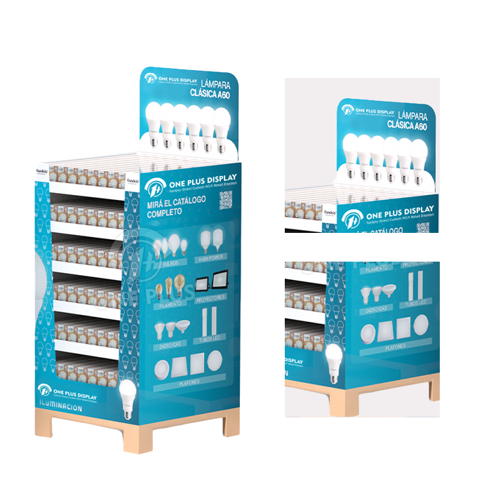 Fit more in less space. The square footprint of this Cardboard Display allows it to sit flush against walls, gondola ends, or other displays without wasting corner space. It offers a clean, organized look perfect for boxed LED bulbs.