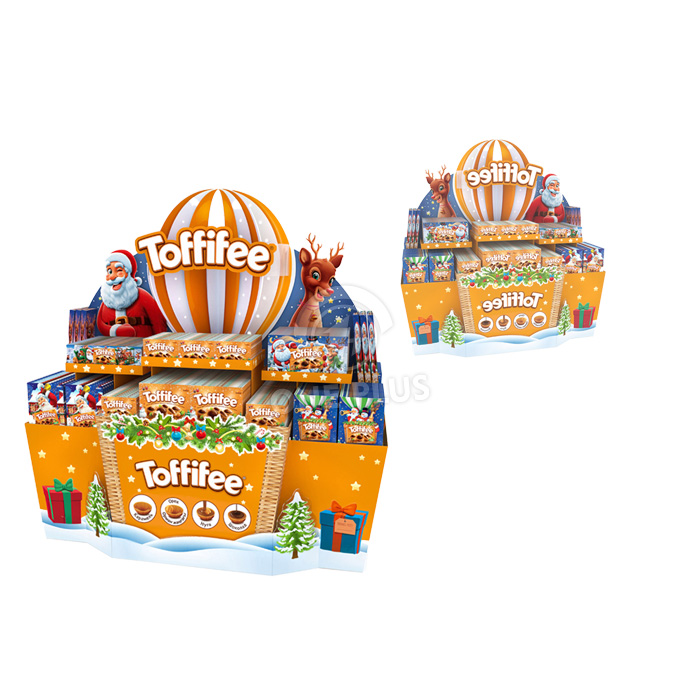 Capture the holiday spirit. This Cardboard Display transforms your product zone into a winter wonderland. With large custom headers featuring Santa Claus or Reindeer, it attracts families and gift-shoppers instantly, boosting sales for chocolates and seasonal treats.