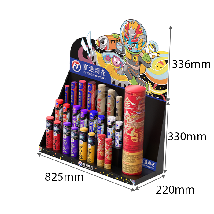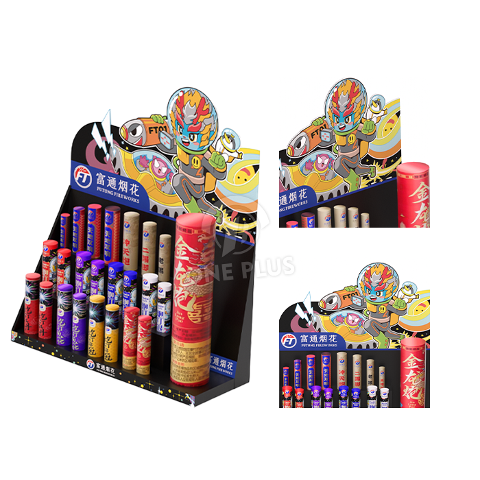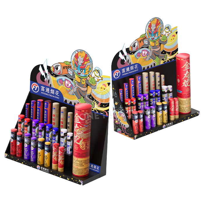 The standout feature of this Cardboard Display is the base. We custom die-cut holes into the stepped tiers to perfectly match the diameter of your firework tubes or sparklers. This ensures products stay upright, organized, and safe from tipping over.