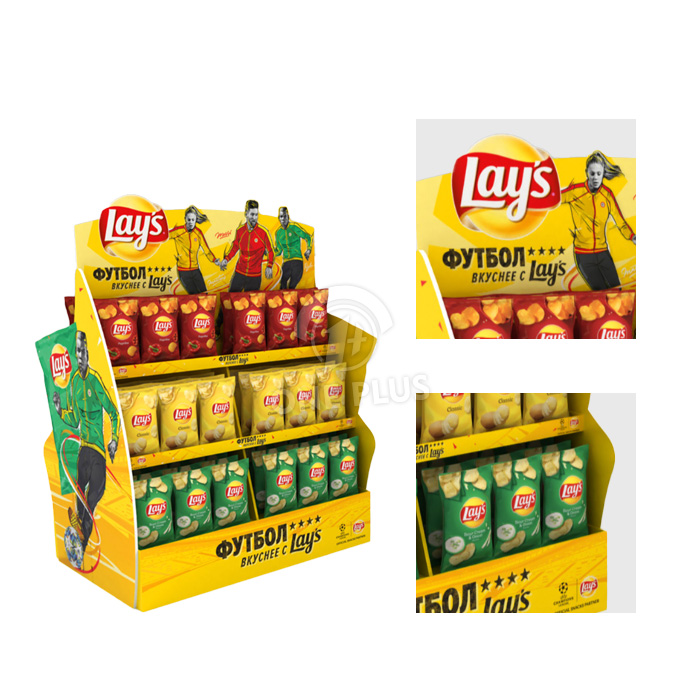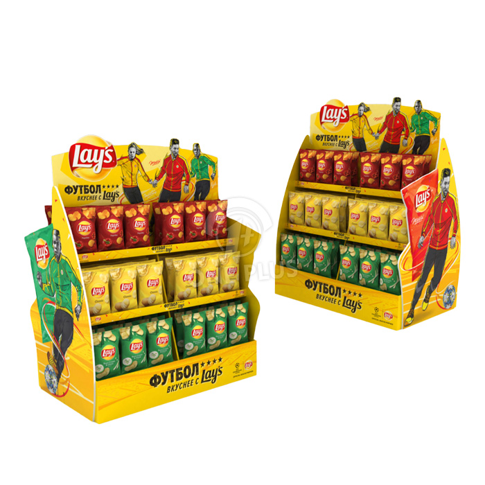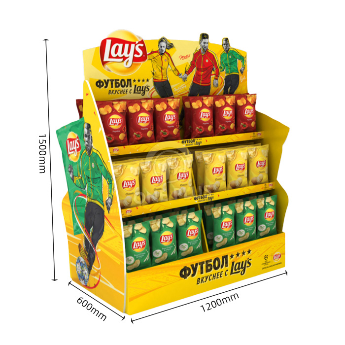 Potato chips are bulky but light. This display utilizes deep shelves and a wide footprint to hold a large volume of puffed snack bags without wasting material weight. The structure is rigid enough to stay stable even when fully stocked.