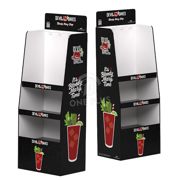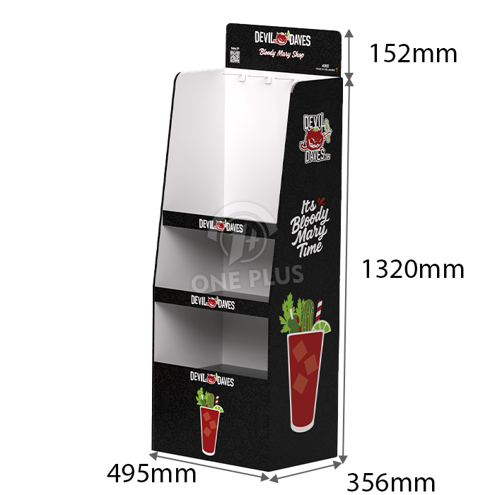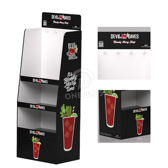Get the best of both worlds. This Cardboard Display combines a pegboard upper section with a tiered lower section. This allows you to merchandise main products (like Bloody Mary mix or shampoo) alongside hanging accessories (like spice blends or hair bands) on a single unit.