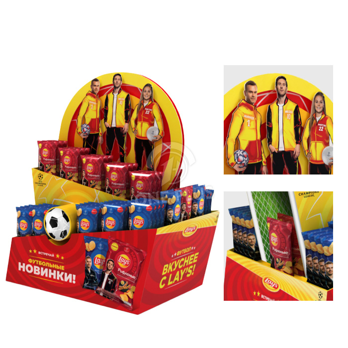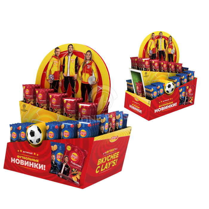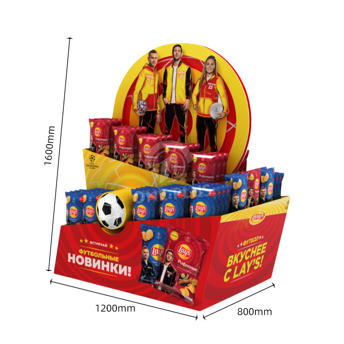 Presentation is everything. Unlike flat bins, this Cardboard Display features a slanted (angled) platform or bin opening. This ergonomic design tilts the chip bags towards the shopper, ensuring the packaging art is fully visible and making it easier to grab the product.
