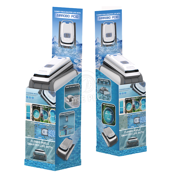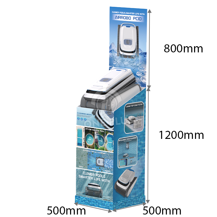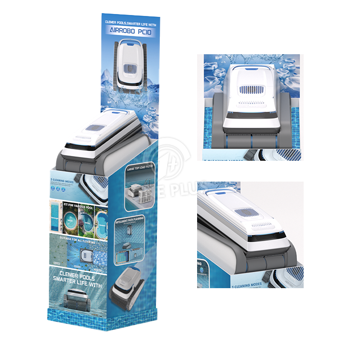 Showcase innovation with strength. Unlike standard shelves, this Cardboard Display is engineered as a solid square column (podium). It utilizes internal cross-supports and high-strength corrugated board to safely hold the weight of a pool cleaning robot on top without collapsing.