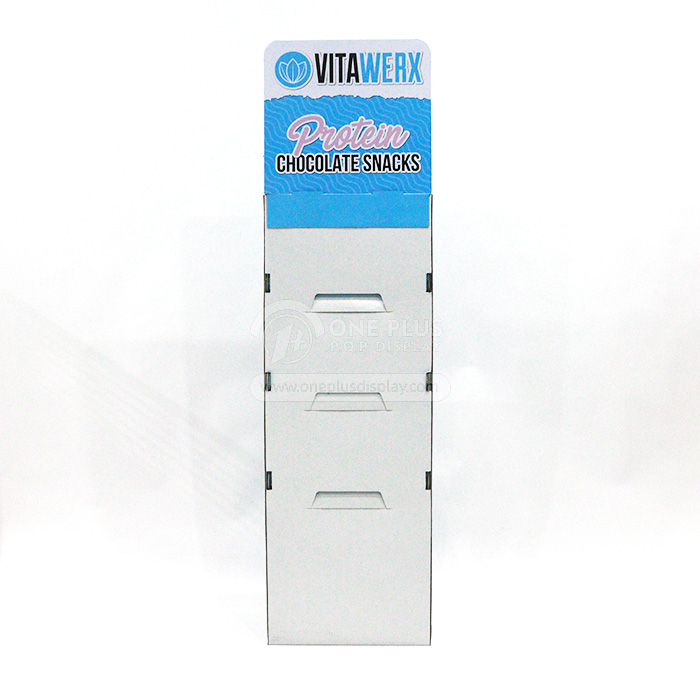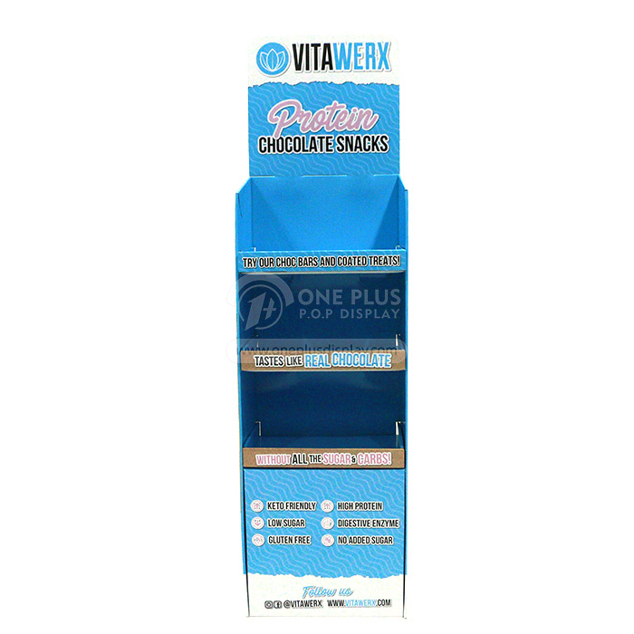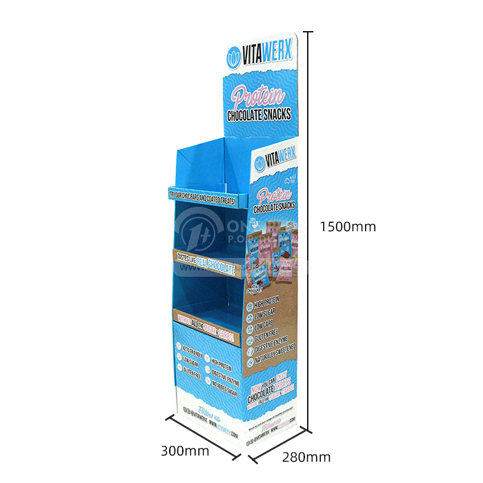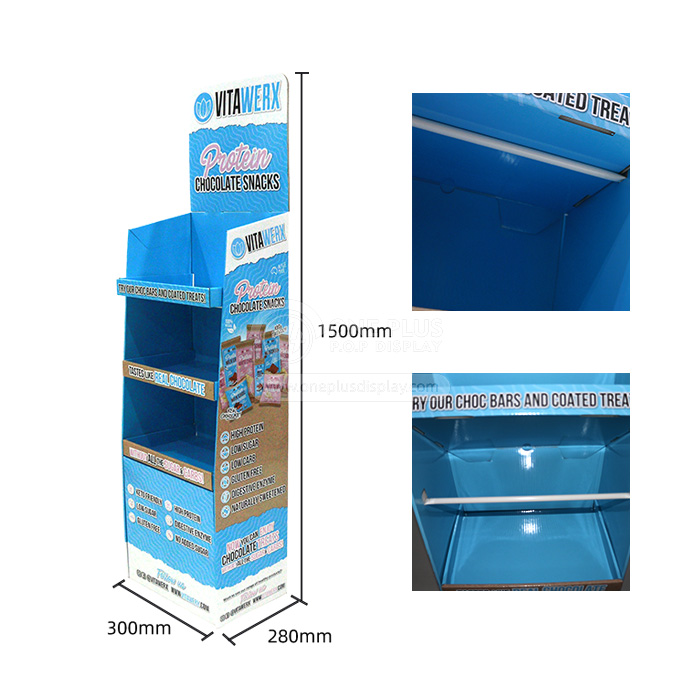 Captivate shoppers and boost your snack sales with our vibrant custom blue corrugated cardboard floor POP display. This eye-catching freestanding display, designed for high-impact promotions, is perfectly tailored for showcasing a variety of snack products, from protein bars and chocolate to chips and candies. Its multi-tiered structure allows for organized product presentation, while the prominent header board provides ample space for your brand's messaging and captivating graphics. Engineered from sturdy, eco-friendly corrugated cardboard, this display is lightweight for easy placement yet robust for demanding retail environments. As a leading factory in custom cardboard display manufacturing, One Plus Display offers complete customization of dimensions, striking full-color graphics, and material specifications to perfectly align with your brand identity and product lineup. We specialize in bespoke retail display solutions and cardboard promotion stands for global brands, ensuring maximum visibility and superior sales conversion. Choose us for professional craftsmanship, competitive wholesale display prices, and reliable worldwide shipping for all your custom cardboard POS display needs.