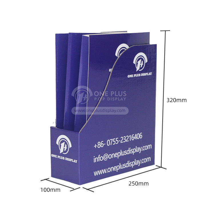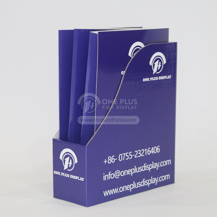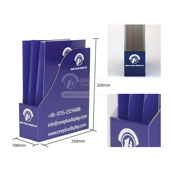Bring order and style to any desk with our versatile custom cardboard desktop document organizer and book holder. Designed to elegantly store and display books, magazines, and A4 document folders, this practical solution is perfect for offices, home studies, or retail environments. As a dedicated manufacturer, One Plus Display offers complete customization in size, graphics, and material finishes to perfectly align with your brand's aesthetic or specific functional requirements. We partner with global brands, delivering bespoke, high-quality display and organization solutions tailored for maximum appeal and durability. Enhance your workspace or product presentation – we provide reliable worldwide shipping for all custom orders, ensuring your unique organizers arrive safely and ready for use.