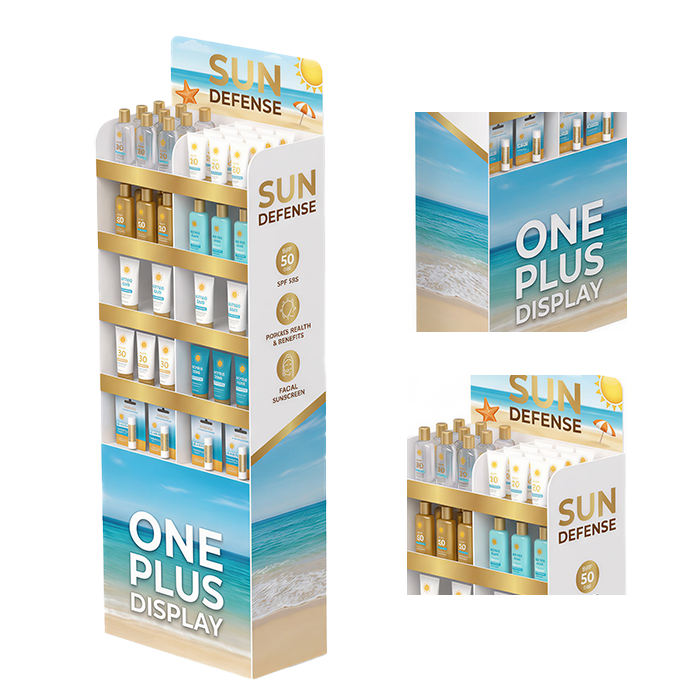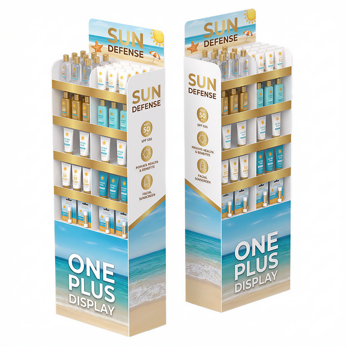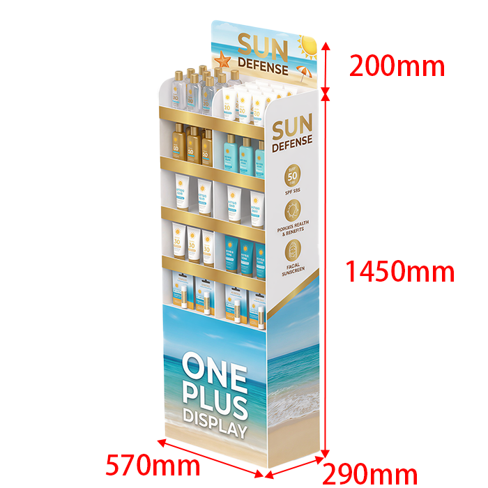 Yes. As a direct POP/POS display stand manufacturer, we can customize the FLOOR DISPLAY with die-cut inserts on specific tiers to hold your sunscreen tubes upside down or keep bottles perfectly aligned.