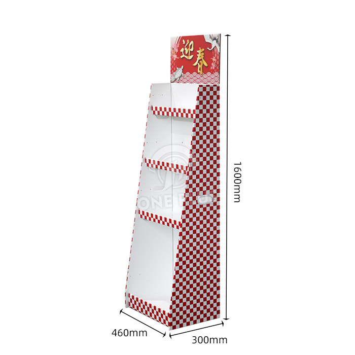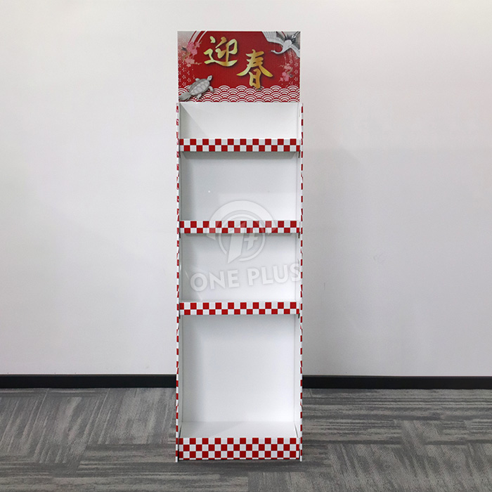 Maximum product exposure. The FLOOR DISPLAY utilizes a slanted, trapezoidal structure. This stepped design ensures that the products on the lower three tiers are not overshadowed by the top tier, making it easy for shoppers of all ages to browse and grab your seasonal gift boxes, candies, or festival goods.
