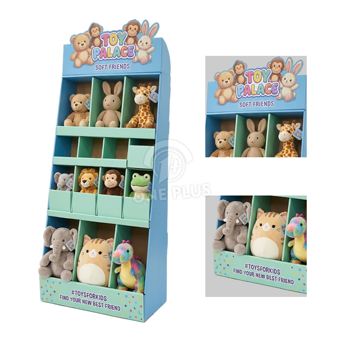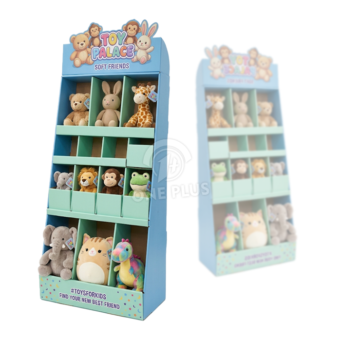 The ultimate solution for soft toys. Plush animals are notoriously difficult to display on flat shelves. This Custom Cardboard Display utilizes interlocking vertical and horizontal dividers to create distinct cubbies. This provides individual support for each doll, keeping your display looking incredibly neat and preventing products from spilling into the aisle.