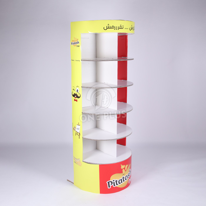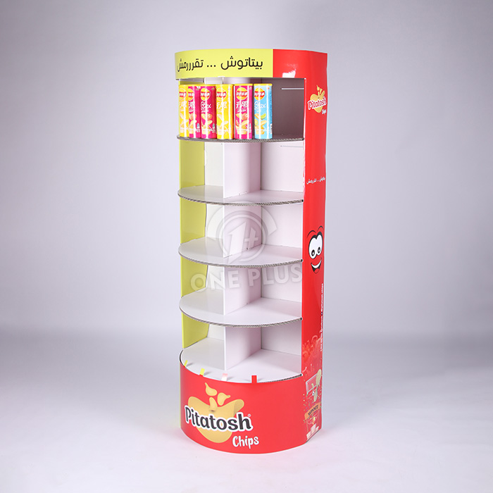 Mimic your product. This Custom Cardboard Display is engineered to replicate the shape of a standard potato chip tube. This “giant replica” effect creates instant brand recognition and makes the display a fun focal point in any supermarket aisle.