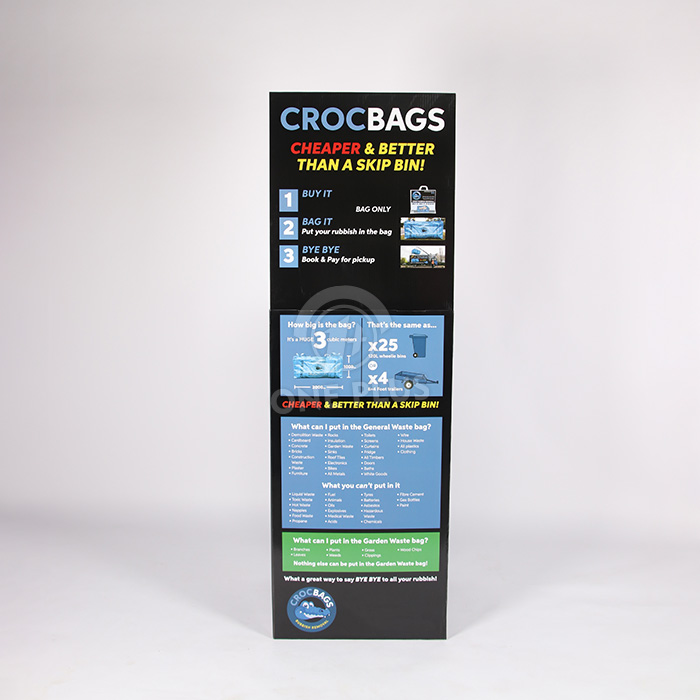 Stand out from the clutter. The bold black background with the blue cartoon crocodile logo makes this bin pop on the retail floor. The “Cheaper & Better” tagline is positioned at eye level on the header to instantly communicate the value proposition.