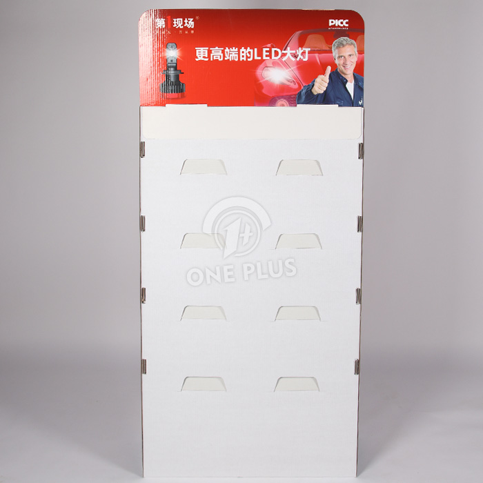 Built for heavy auto parts. The defining feature of this stand is the use of plastic sliding buckles (shelf clips). These clips lock the shelves firmly to the side walls, significantly increasing the load-bearing capacity. This ensures your Custom Cardboard Display stays rigid even when fully stocked with heavy LED headlight boxes.