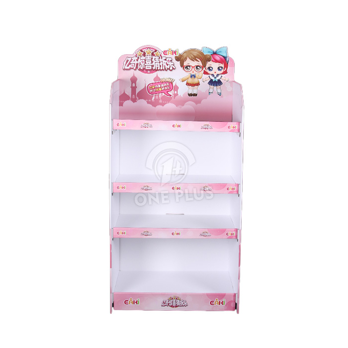 This Custom Cardboard Display uses strong plastic shelf clips under each tier These clips lock the shelves firmly to the side walls preventing sagging when loaded with heavy blind boxes