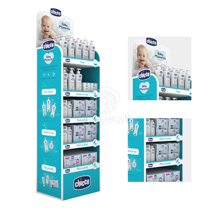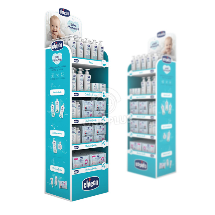Maximize aisle impact The display features five well proportioned shelves complete with clear categorization labels on the front lips This logical layout allows shoppers to easily browse through your entire product line from bath time essentials to diaper changing accessories