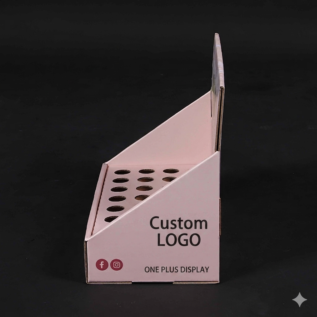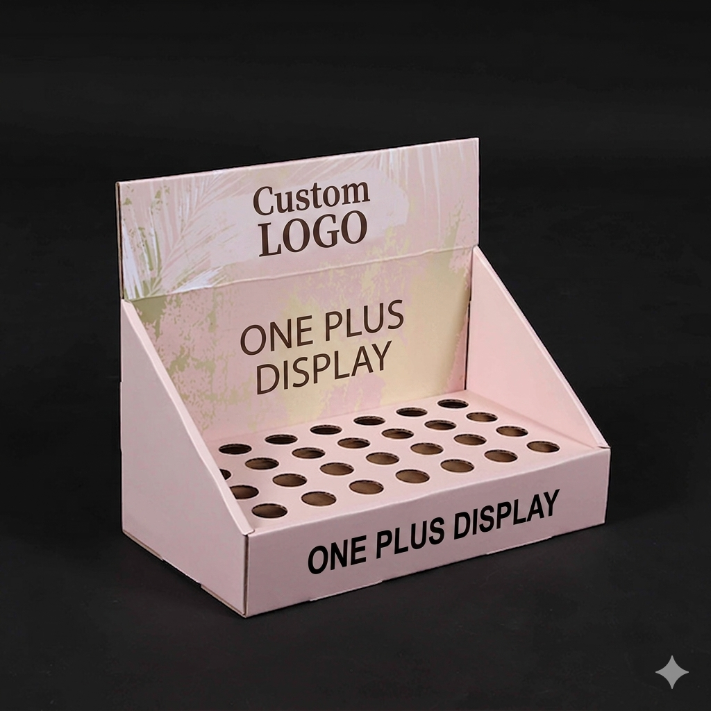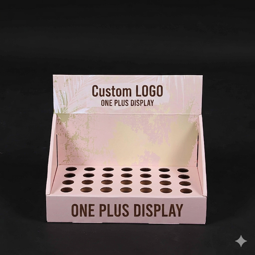 Perfekte Passform für Tuben. Dieses Custom Cardboard Display verfügt über einen speziellen Einsatz mit kreisförmigen Löchern. Jedes Loch ist millimetergenau bemessen, um Ihre Lipgloss- oder Mascara-Tuben fest aufrecht zu halten und zu verhindern, dass sie in einem belebten Geschäft wackeln oder umfallen.