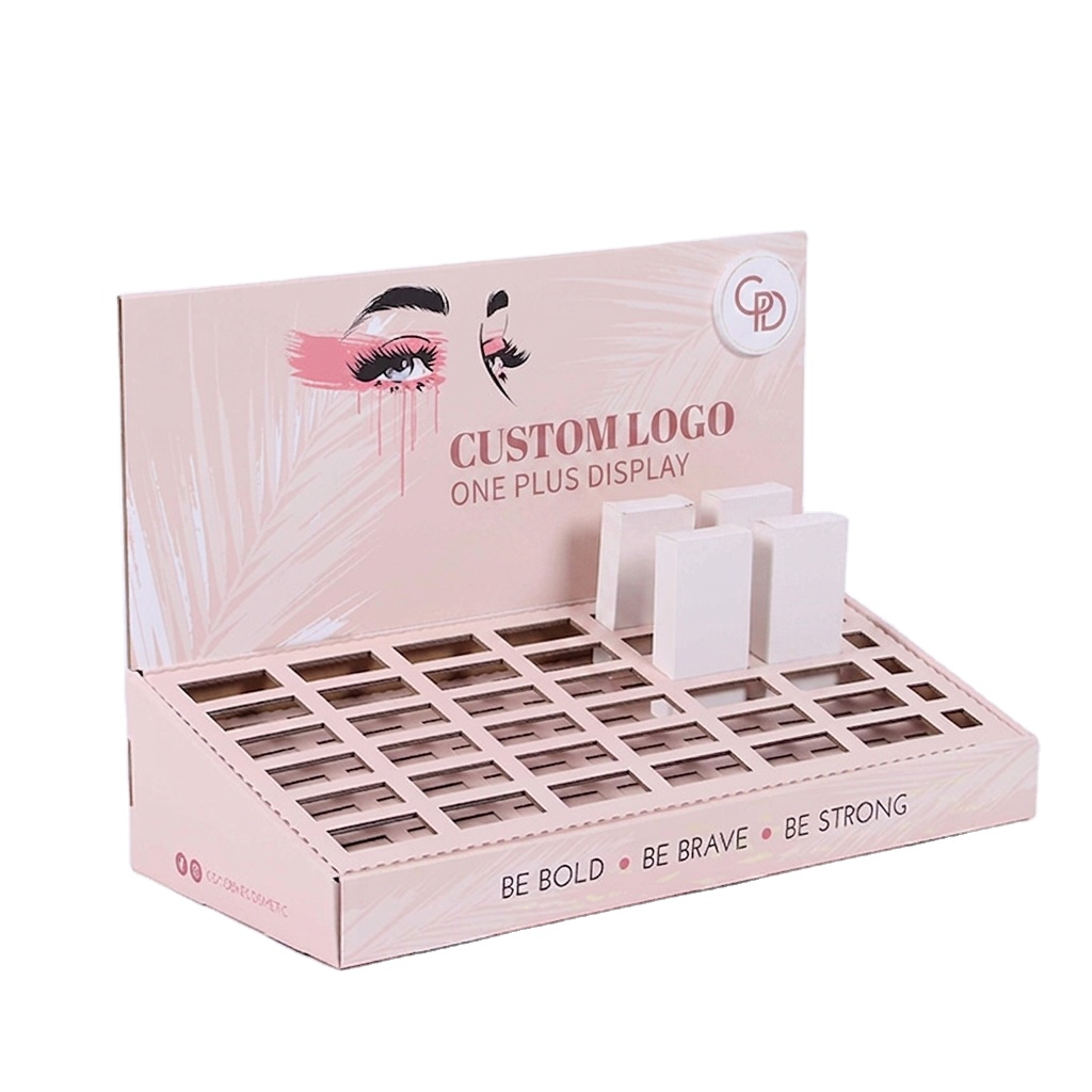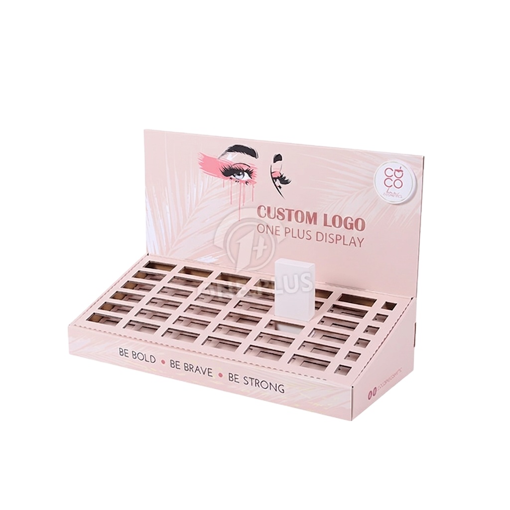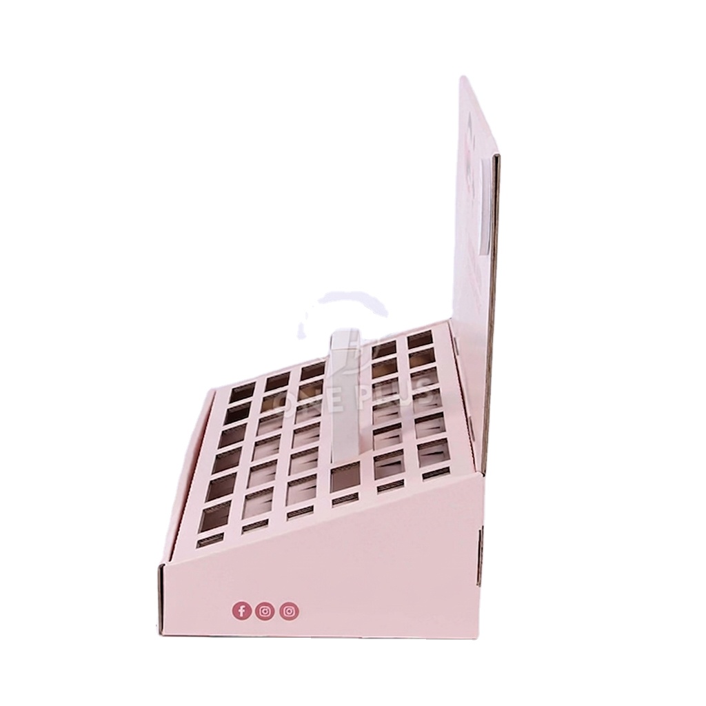 Perfekte Organisation. Das bestimmende Merkmal dieses individuellen Pappaufstellers ist die interne Gitterunterteilung. Jeder Schlitz ist exakt auf die Abmessungen Ihrer Produktbox (z. B. Lidschatten oder Wimpern) zugeschnitten. Dies hält den Bestand sicher, aufrecht und gleichmäßig verteilt und verhindert das Aussehen eines “unordentlichen Regals”.