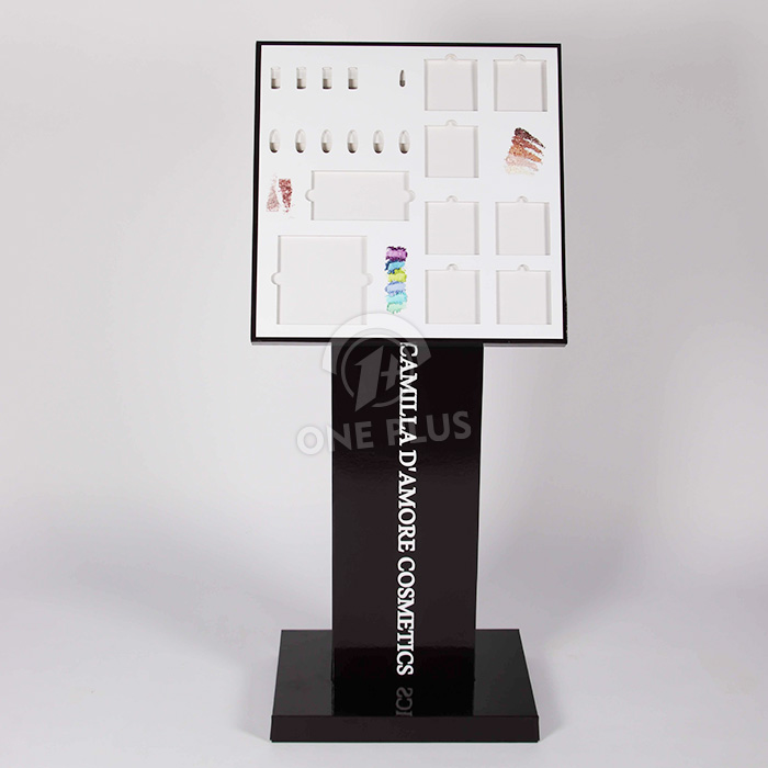 Diseño totalmente personalizable. ¿Tienes una botella de base cuadrada o un labial redondo? Personalizamos el diseño del corte en el tablero superior para que se ajuste a tu surtido específico de SKU. También podemos imprimir tu logotipo en lámina plateada o dorada en la columna para añadir un toque de lujo.