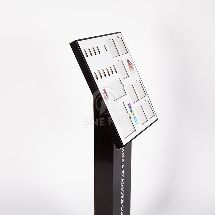 Lujo a menor precio. Aunque está hecho de cartón rentable, el exterior está tratado con un laminado negro de alto brillo (como se muestra). Esto le da al expositor un aspecto elegante, similar al acrílico, que encaja perfectamente en grandes almacenes de alta gama y salones de belleza.