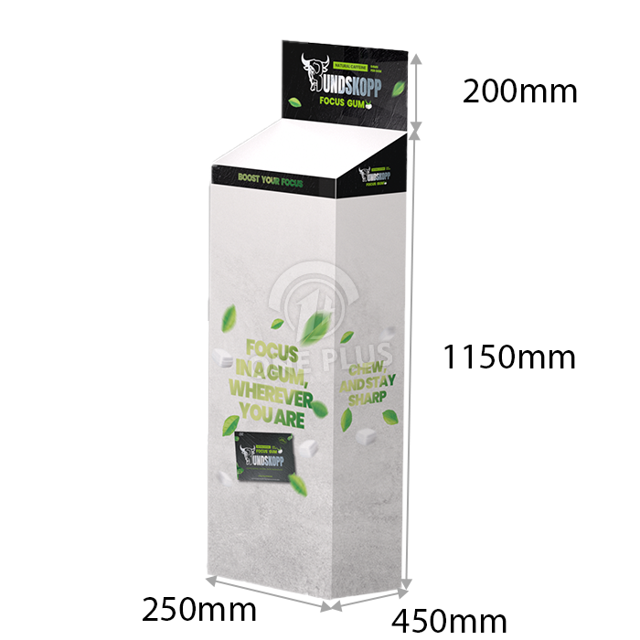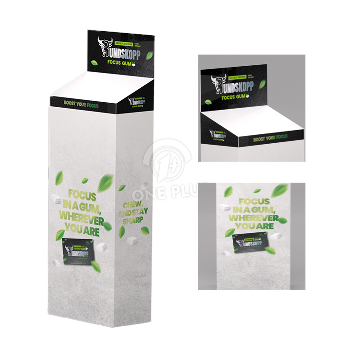 Esta versátil. Display de Cartón está diseñada para ser multifuncional. Incluye una base robusta para colocarse en mostradores de caja y también puede equiparse con clips para colgarse como Complemento (Ala de Poder) en gondolas minoristas estándar.
