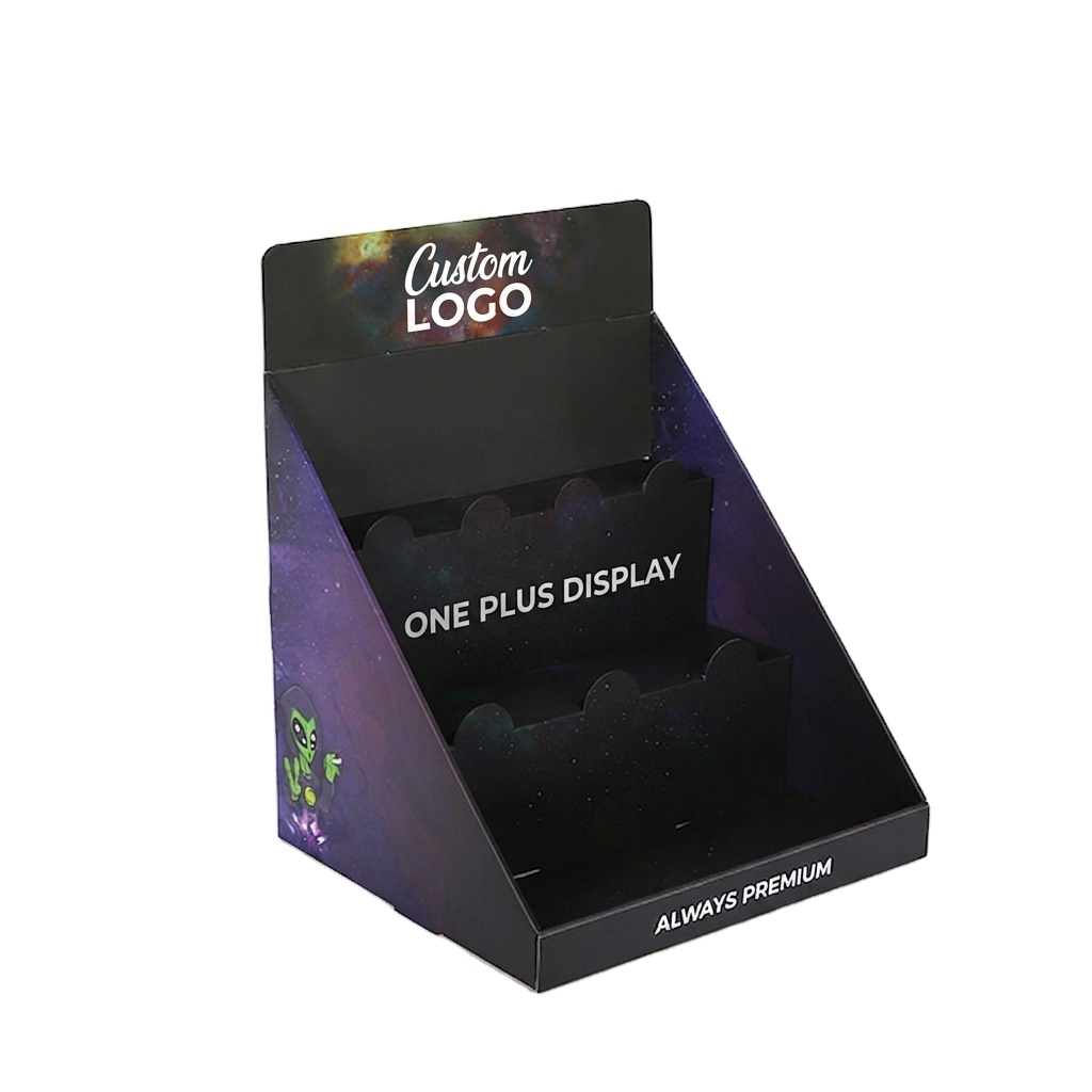 Tyyli ja tarkoitus. Toisin kuin tavallisissa tasaisissa hyllyissä, tämän pahvinäytön jokaisessa tasossa on kohotetut puolipyöreät kielekkeet (välilevyt). Nämä toimivat tehokkaina tuotepysäyttiminä varmistaen, että pienet esineet, kuten vape-pullot tai huulivoiteet, pysyvät tukevasti paikoillaan eivätkä liu'u eteenpäin.