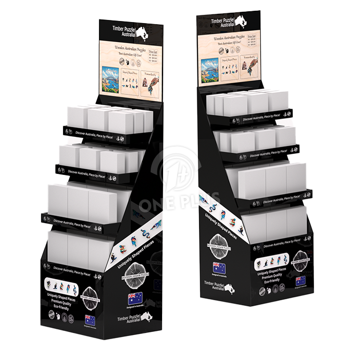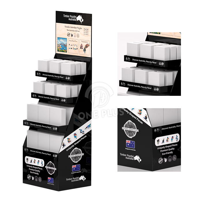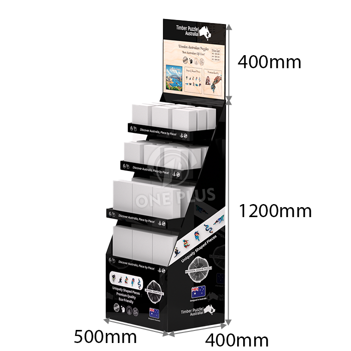 Ce Présentoir de Sol en Carton à Gradins résout le défi de la mise en avant de tailles d'emballages différentes. Les deux niveaux supérieurs sont moins profonds pour les petites boîtes (ex., friandises pour animaux), tandis que les deux niveaux inférieurs sont plus profonds et plus hauts pour les boîtes plus grandes (ex., sacs de nourriture pour animaux).