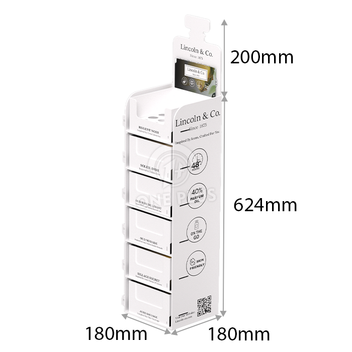 Con sei livelli dedicati, questa struttura verticale massimizza l'efficienza dello spazio a pavimento, permettendoti di esporre un vasto assortimento di piccoli prodotti in bottiglia in un'ingombro ridotto.