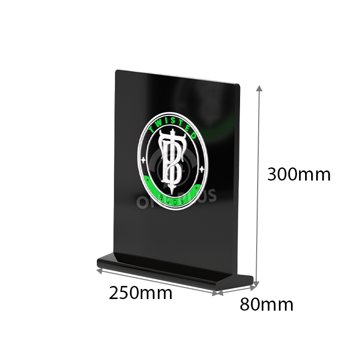 高品質鋳造アクリル(PMMA)製で、ガラスのような仕上げと優れた耐久性を提供します。光沢のある黒い表面は、ロゴやテキストを際立たせる高コントラストの背景を提供します。