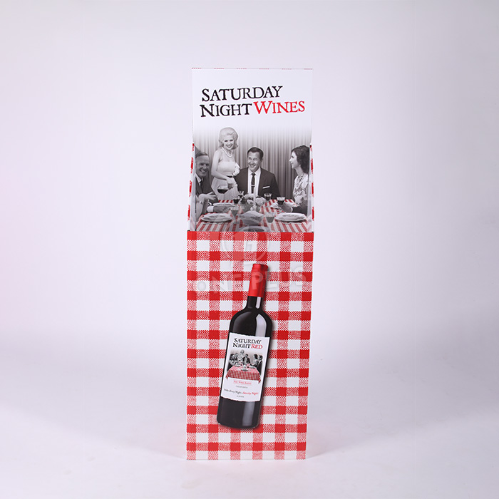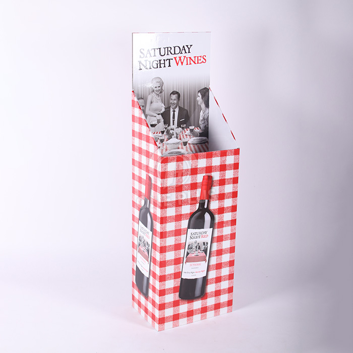 테마 마케팅. 선반 디스플레이와 달리 이 바닥 빈은 독립적으로 서 있으며 브랜딩을 위한 네 개의 큰 패널을 제공합니다. “토요일 밤 와인” 예시에서 볼 수 있듯이 연속 패턴(피크닉 체크와 같은) 또는 라이프스타일 이미지를 인쇄하여 특정 식사 기회를 연출할 수 있습니다.