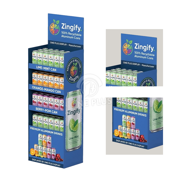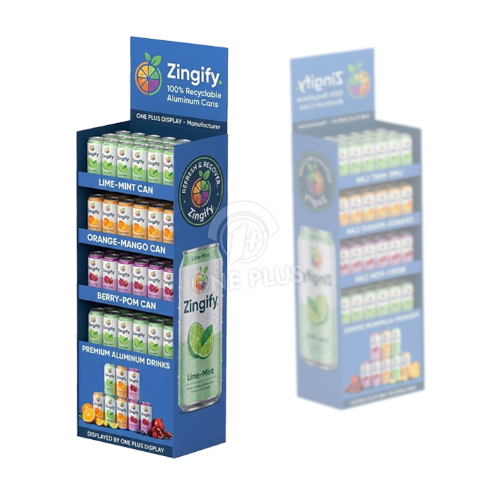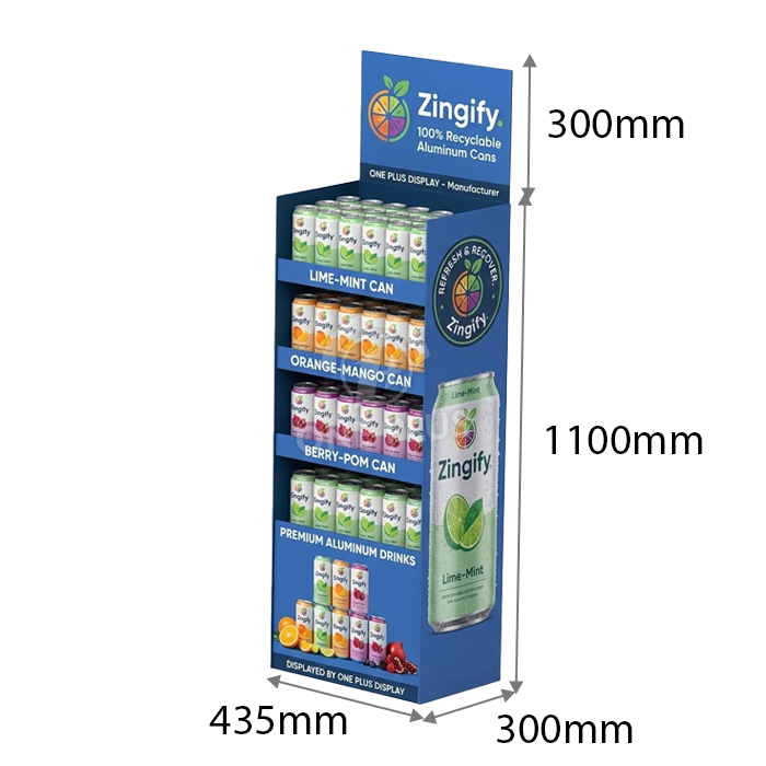Denne Pappgulvdisplayen benytter en velprøvd 4-nivå struktur som maksimerer vertikal detaljhandelsplass. Den gir rikelig plass til å lagre et stort volum av hermetikkdrikker eller juicekartonger, noe som reduserer behovet for hyppig påfyll.