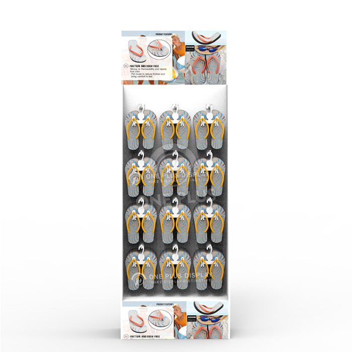 Ryddig og tilgjengelig. Enheten leveres med solide plastkroker arrangert i 3 kolonner og 4 rader. Denne 12-kroks matrisen holder flip-flops pent foran, noe som gjør det utrolig enkelt for kunder å bla gjennom sin foretrukne farge og størrelse uten å skape rot.