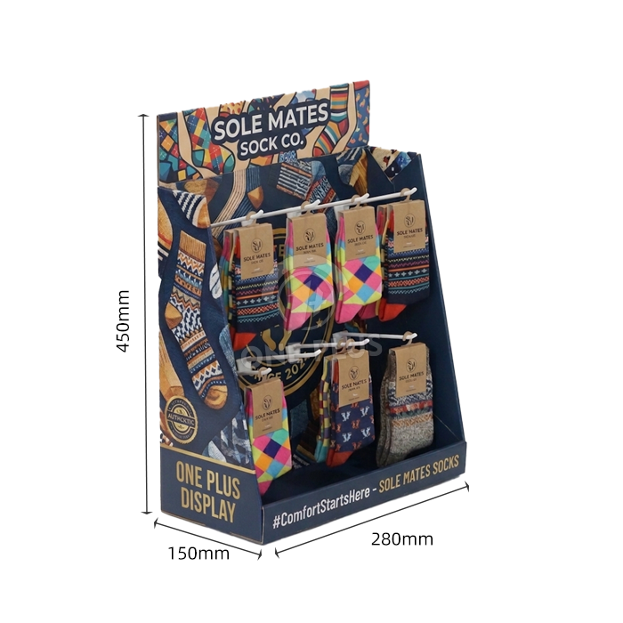 Organiseer verpakte goederen moeiteloos. Deze Custom Cardboard Display is uitgerust met een stevige rij plastic of metalen haken. Het is perfect ontworpen voor het ophangen van blisterverpakkingen of verpakte sokken, zodat producten altijd naar voren gericht, netjes en klaar zijn voor snelle "grab-and-go" aankopen.