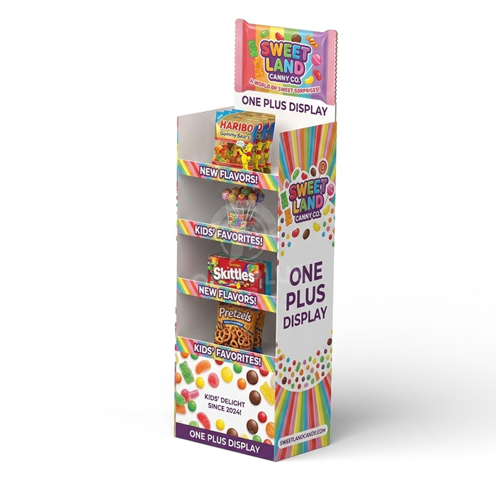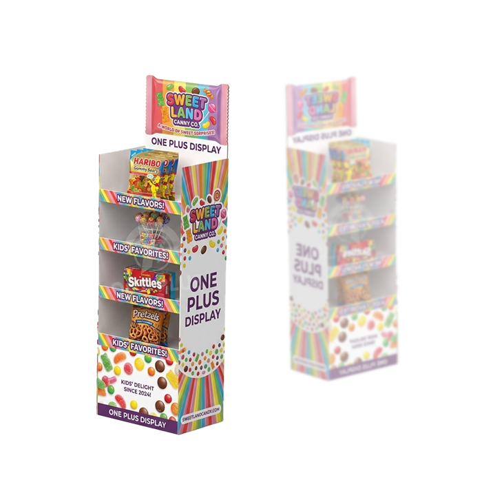 The pop-up mechanism is designed with internal reinforced locking supports, ensuring the shelves remain stable and structurally sound for packaged candy and snacks.