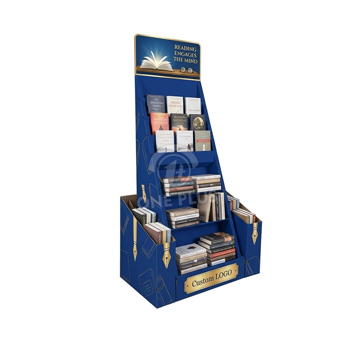 This FLOOR DISPLAY utilizes a stepped pocket design to ensure that even when fully stocked, the covers of books in the back rows remain visible, solving the issue of products being hidden.