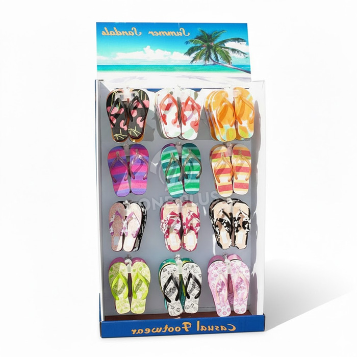 双倍曝光。这款宽大的定制纸板展示架专为中心过道设计,允许顾客同时从两侧购物。这种双向布局显著增加了您的产品正面展示,对于销售大量季节性鞋类非常有效。