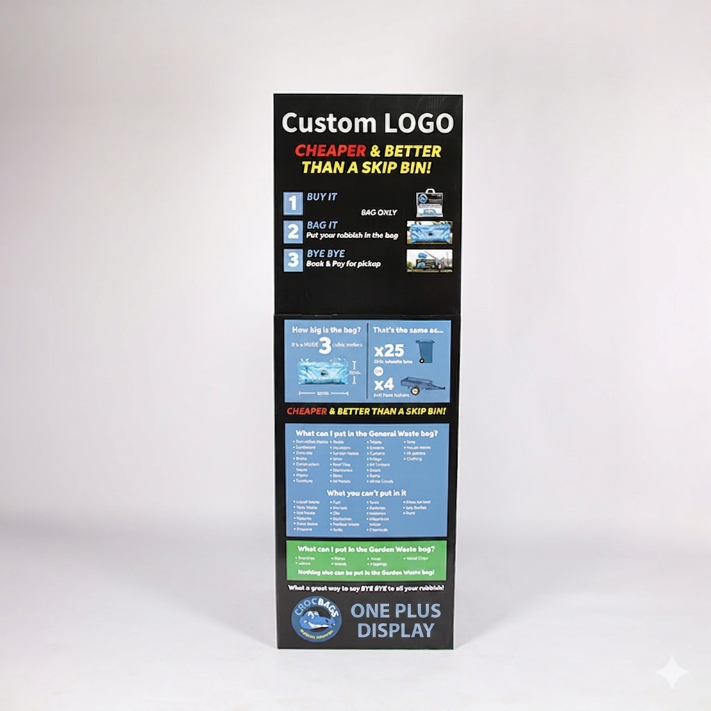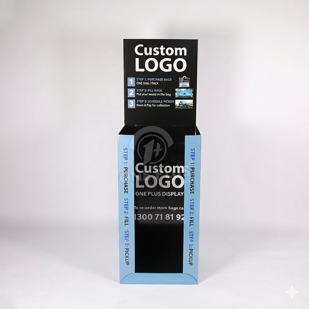 10. 解释价值。对于专用垃圾袋等功能性产品,顾客需要知道 11. 如何 12. 使用。当您与我们一起定制垃圾桶时,我们可以在顶卡和桶身上直接打印详细的图示(如“1-购买,2-装袋,3-带走”步骤),以指导购买决策。 定制POP展示架 13. 坚固的结构,可承载重物