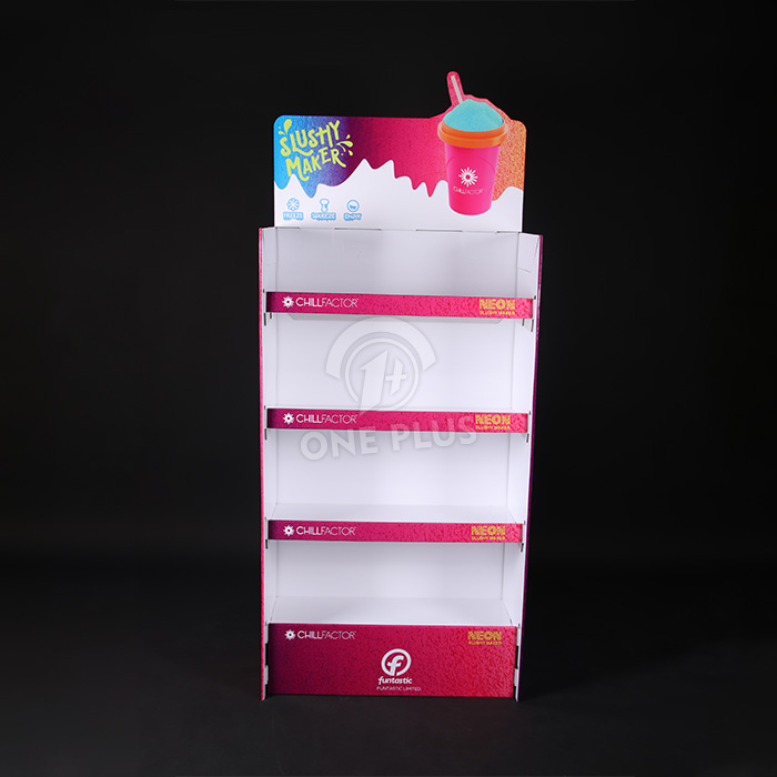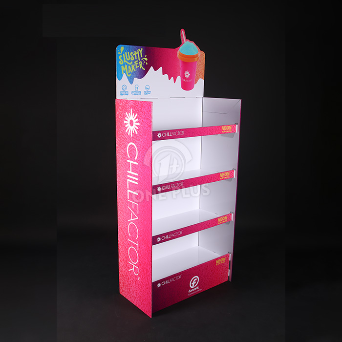 坚固安全. 冰沙机或保温杯的堆叠会变得很重. 塑料夹将重量直接传递到垂直侧板,防止纸板货架在库存负载下弯曲或坍塌.